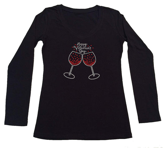 Womens T-shirt with Happy Valentine's Day Wine Cups in Spangles
