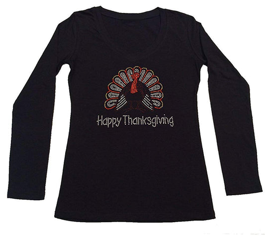 Womens T-shirt with Happy Thanksgiving with Turkey in Rhinestones