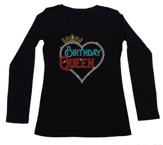 Women's Rhinestone Fitted Tight Snug Shirt Birthday Queen with Heart and Crown Birthday Bling