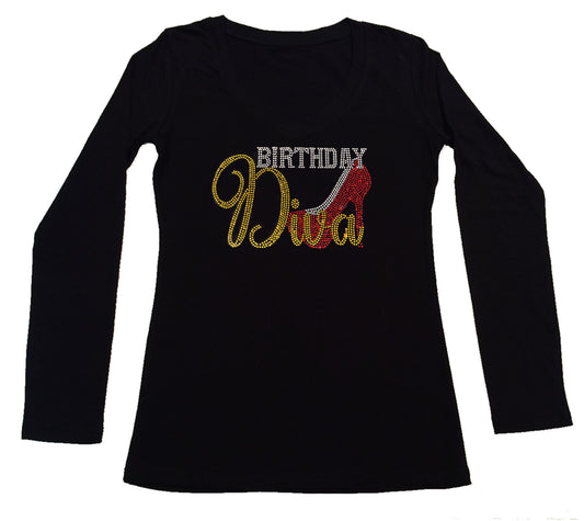 Women's Rhinestone Fitted Tight Snug Shirt Birthday Diva with Red High Heel - Birthday Shirt, Bling Shirt