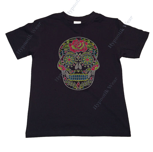 Girls Rhinestone / Suds T-Shirt " Colorful Sugar Skull with Rose " Size 3 to 14 Halloween