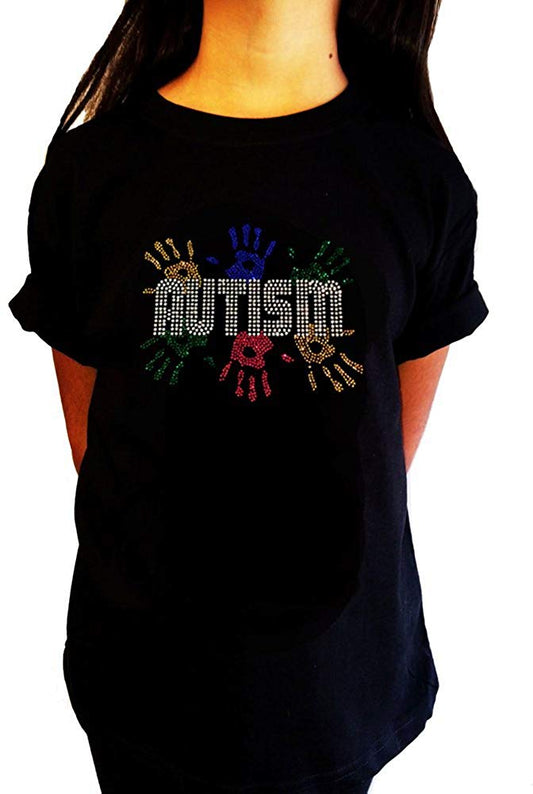 Girls Rhinestone T-Shirt " Autism Awareness with Handprint in Rhinestones " Kids Size 3 to 14 Available