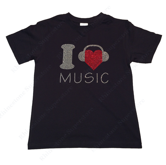 Girls Rhinestone T-Shirt " I Love Music with Headphones " Size 3 to 14 Available