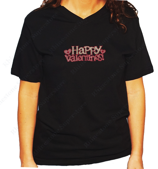 Women's / Unisex T-Shirt with Happy Valentines with Hearts in Rhinestones