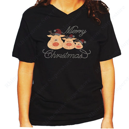 Women's / Unisex T-Shirt with Merry Christmas 3 Reindeer in Glitters and Rhinestones