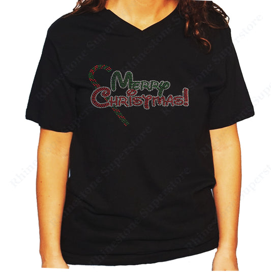 Women's / Unisex T-Shirt with Merry Christmas With Candy Cane in Rhinestones