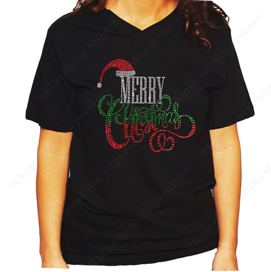 Women's / Unisex T-Shirt with Merry Christmas With Santa Hat in Rhinestones