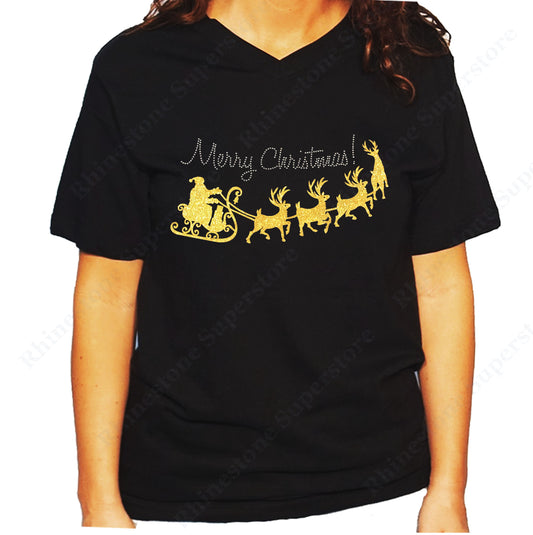 Women's / Unisex T-Shirt with Merry Christmas with Yellow Santa Sleigh in Glitters and Rhinestones