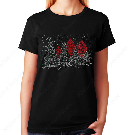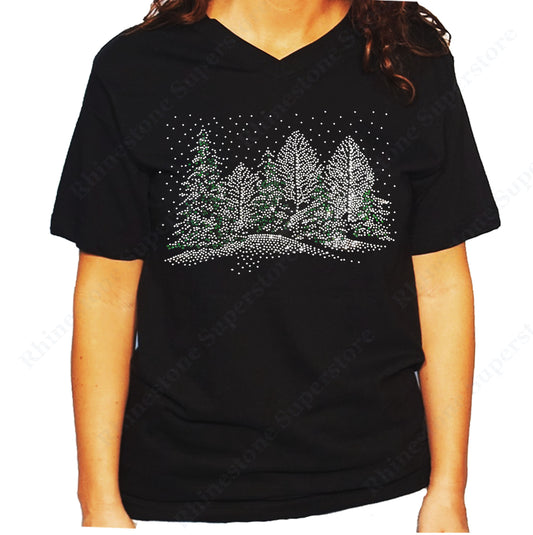 Women's / Unisex T-Shirt with Winter Scene with Snow and Christmas Trees in Rhinestones