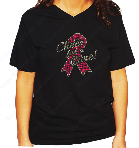 Women's / Unisex T-Shirt with Cheer for a Cure with Pink Cancer Ribbon in Rhinestones