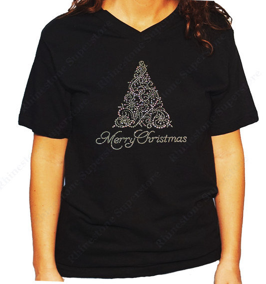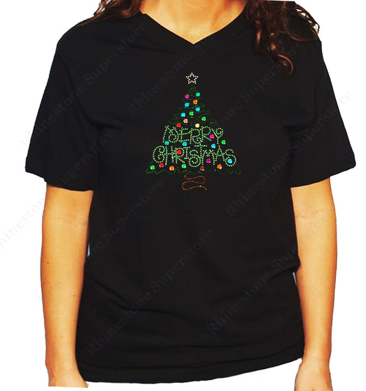 Women's / Unisex T-Shirt with Merry Christmas Green Tree in Rhinestones