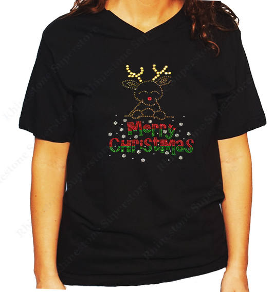 Women's / Unisex T-Shirt with Merry Christmas Rudolph the Red Nose Reindeer in Rhinestones