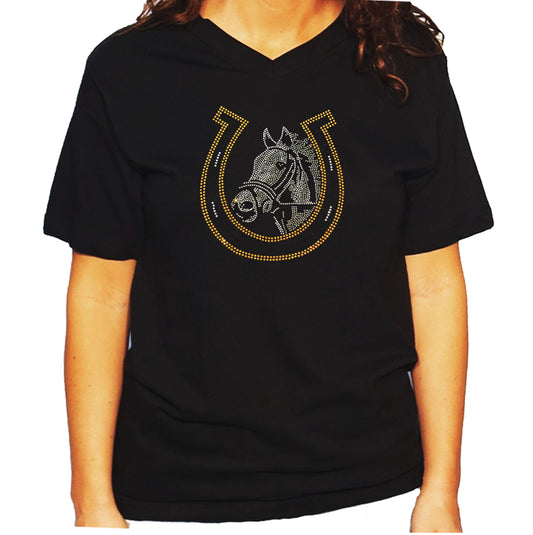 Women's / Unisex T-Shirt with Horse and Lucky Horseshoe - Equestrian in Rhinestones