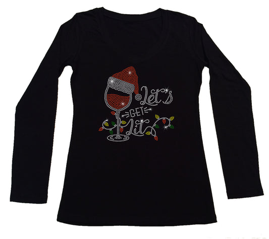 Women's Rhinestone Fitted Tight Snug Shirt Let's Get Lit Wine Glass with Santa Hat - Christmas Lights, Christmas Shirt