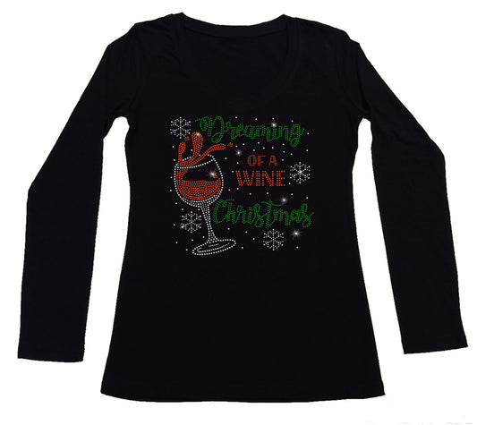 Women's Rhinestone Fitted Tight Snug Shirt Dreaming of a Wine Christmas - Wine Shirt, Christmas Shirt, Rhinestone Shirt