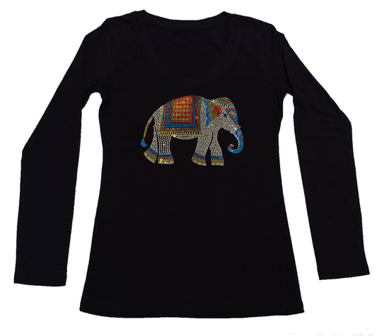 Women's Rhinestone Fitted Tight Snug Shirt Colorful Indian Elephant