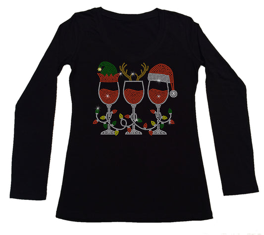 Women's Rhinestone Fitted Tight Snug Shirt Elf Reindeer Santa Hat Wine Cups - Wine Shirt, Christmas Shirt