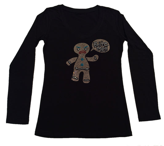 Women's Rhinestone Fitted Tight Snug Shirt Gingerbread Man with Bite Me Bubble