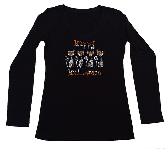 Women's Rhinestone Fitted Tight Snug Shirt Happy Halloween Cats with Masks - Halloween Shirt
