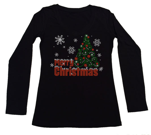 Women's Rhinestone Fitted Tight Snug Shirt Merry Christmas Snowcapped - Christmas Shirt