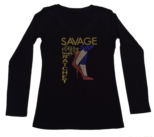 Women's Rhinestone Fitted Tight Snug Shirt Savage, Classy, Bougie, Ratchet