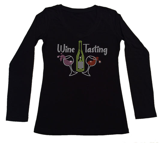 Women's Rhinestone Fitted Tight Snug Shirt Wine Tasting - Wine Glasses and Wine Bottles