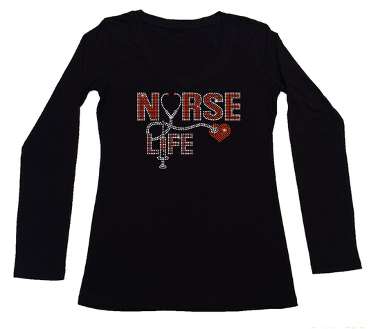 Women's Rhinestone Fitted Tight Snug Shirt " Nurse Life w/ Stethoscope & Heart " in S, M, L, 1X, 2X, 3X