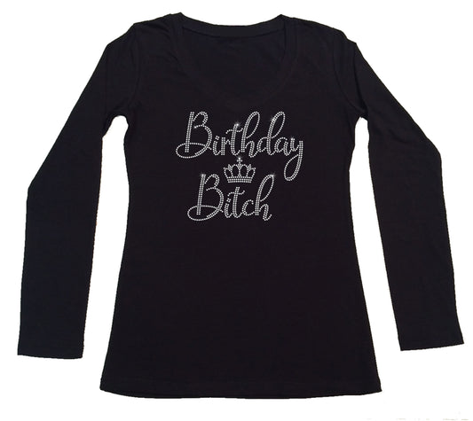 Womens T-shirt with Birthday Bitch with Crown in Rhinestones