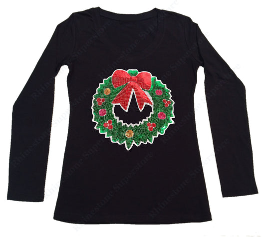 Womens T-shirt with Christmas Reef with Red Bow in Sequence