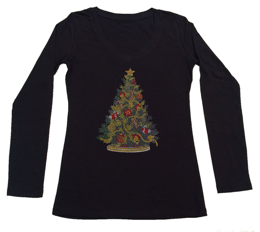 Womens T-shirt with Colorful Christmas Tree in Rhinestuds