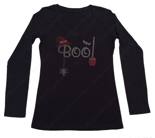 Womens T-shirt with Halloween Boo with Broom in Rhinestones