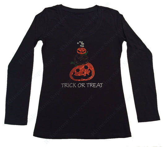 Womens T-shirt with Halloween Pumpkins with Trick or Treat in Rhinestones