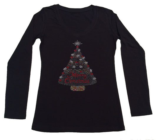 Womens T-shirt with Merry Christmas Colorful Tree in Rhinestones
