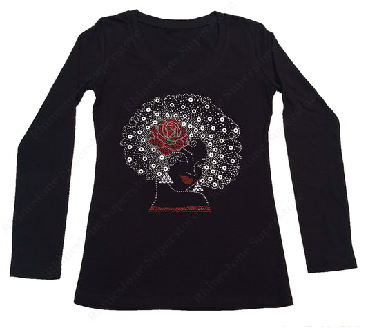 Womens T-shirt with Afro Girl with Red Rose in Rhinestones