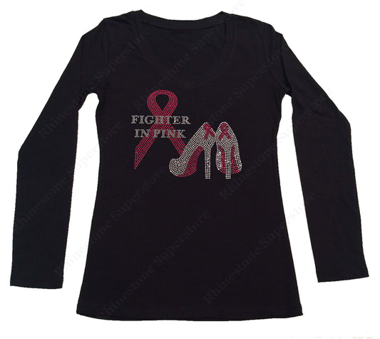 Womens T-shirt with Pink Cancer Ribbon & Heels in Rhinestones