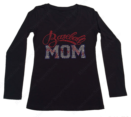 Womens T-shirt with Red Baseball Mom in Rhinestones