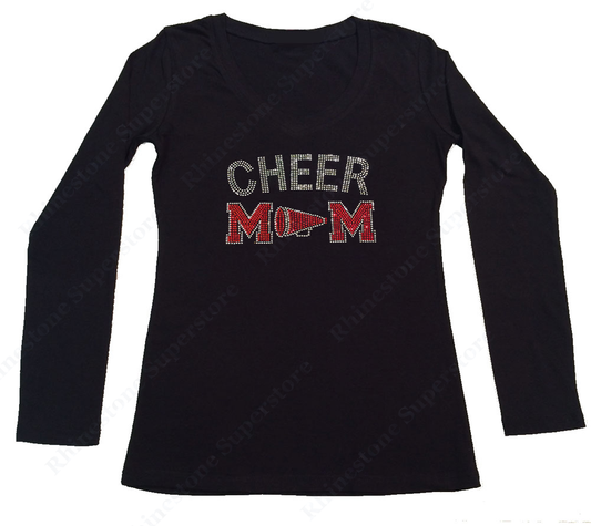 Womens T-shirt with Red Cheer Mom with Megaphone in Rhinestones