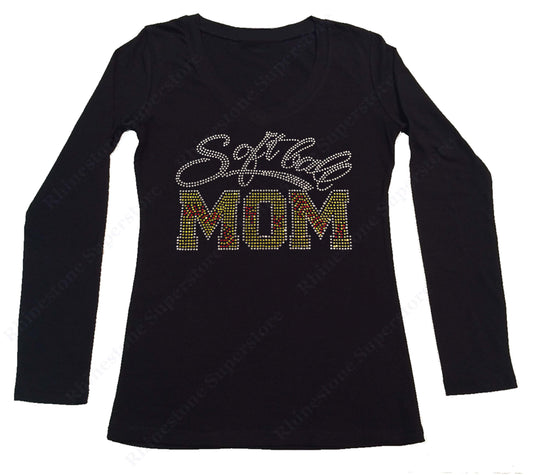Womens T-shirt with Softball Mom with Heart in Rhinestones