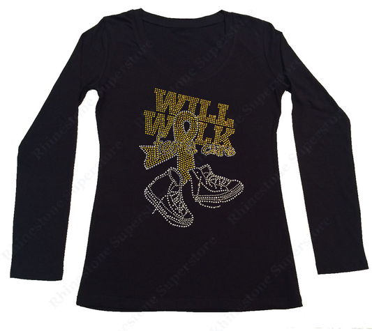 Womens T-shirt with Will Walk for a Cure Leukemia Cancer Ribbon in Rhinestones