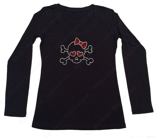 Womens T-shirt with Skull with Red Bow and Eyes in Rhinestones