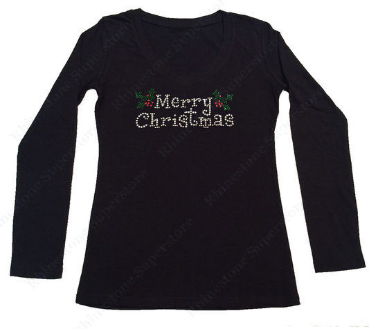 Womens T-shirt with Merry Christmas Reindeer in Rhinestones