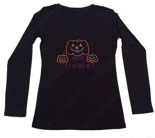 Womens T-shirt with Neon Pumkins Got Treats in Rhinestuds