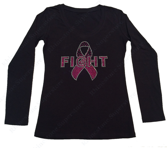 Womens T-shirt with Pink Fight Cancer Ribbon in Rhinestones