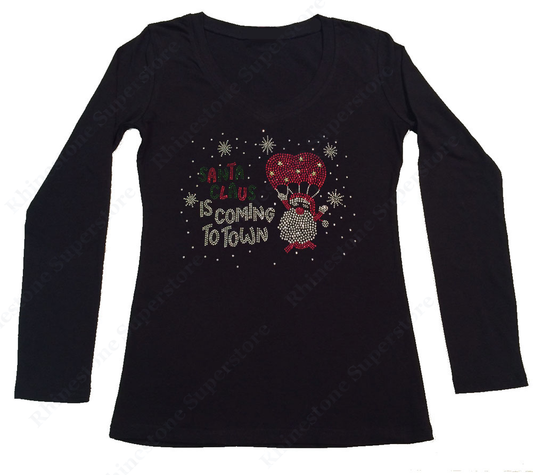 Womens T-shirt with Santa Claus Is Coming to Town in Rhinestones
