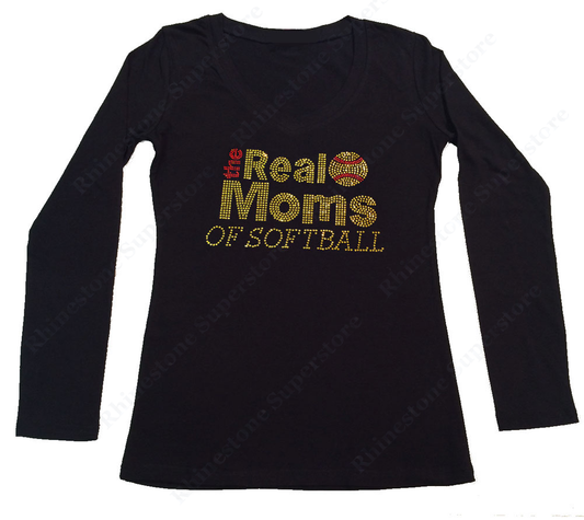 Womens T-shirt with the Real Moms of Softball in Rhinestones