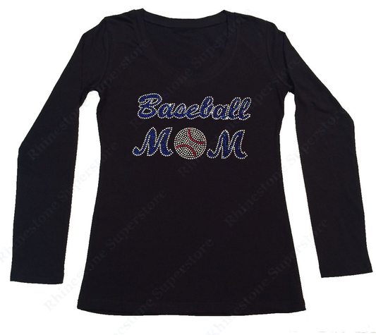 Womens T-shirt with Blue Baseball Mom in Rhinestones