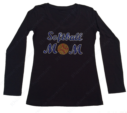 Womens T-shirt with Blue Softball Mom in Rhinestones