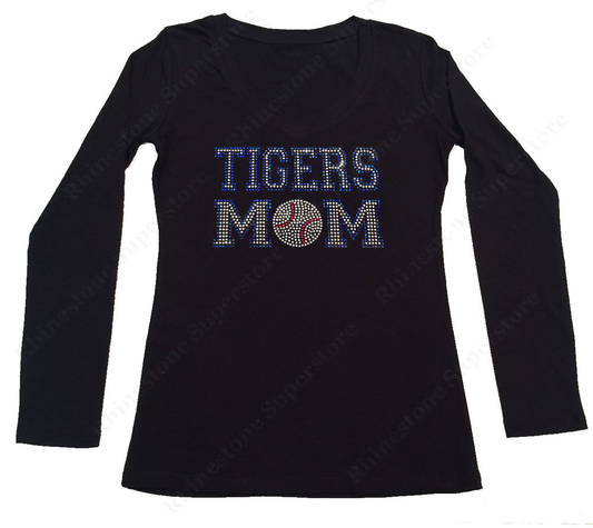 Womens T-shirt with Blue Tigers Mom in Rhinestones