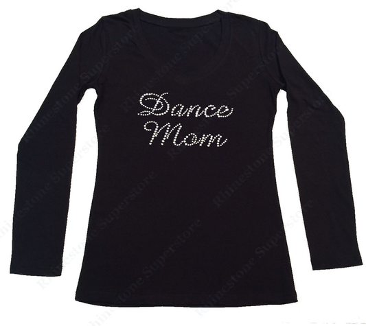 Womens T-shirt with Dance Mom in Script in Rhinestones