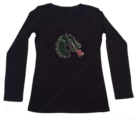 Womens T-shirt with Green Dragon with Flames in Rhinestones
